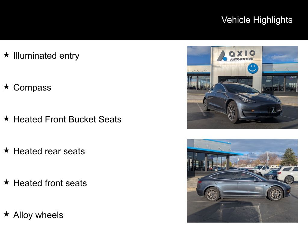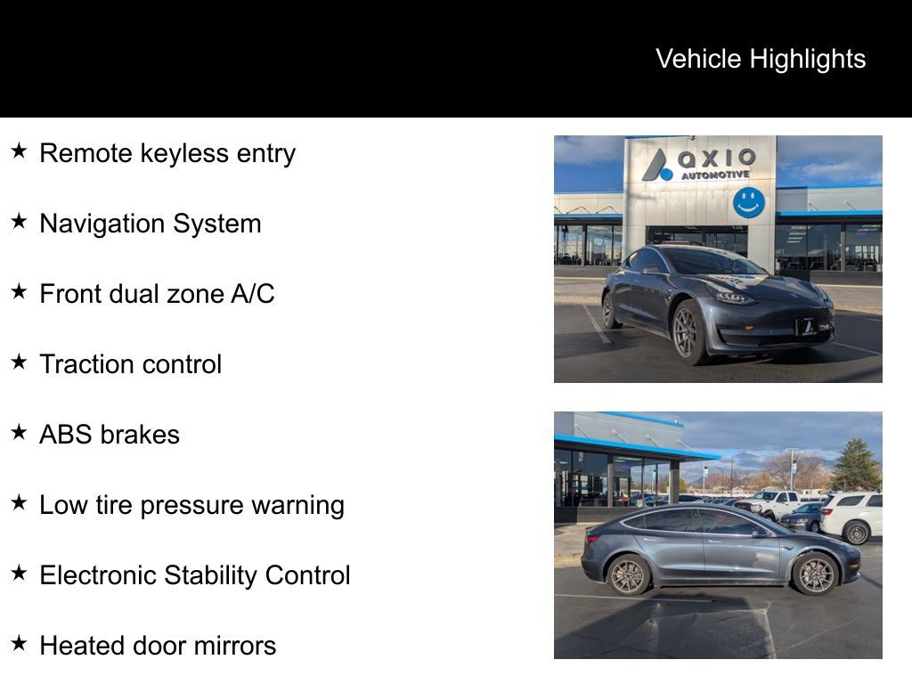 Silver 2018 Tesla Model 3 Long Range RWD 1-Speed Automatic Electric Motor ABS brakes, Alloy wheels, Compass, Electronic Stability Control, Front dual zone A/C, Heated door mirrors, Heated Front Bucket Seats, Heated front seats, Heated rear seats, Illuminated entry, Low tire pressure warning, Navigation System, Remote keyless entry, Traction control.